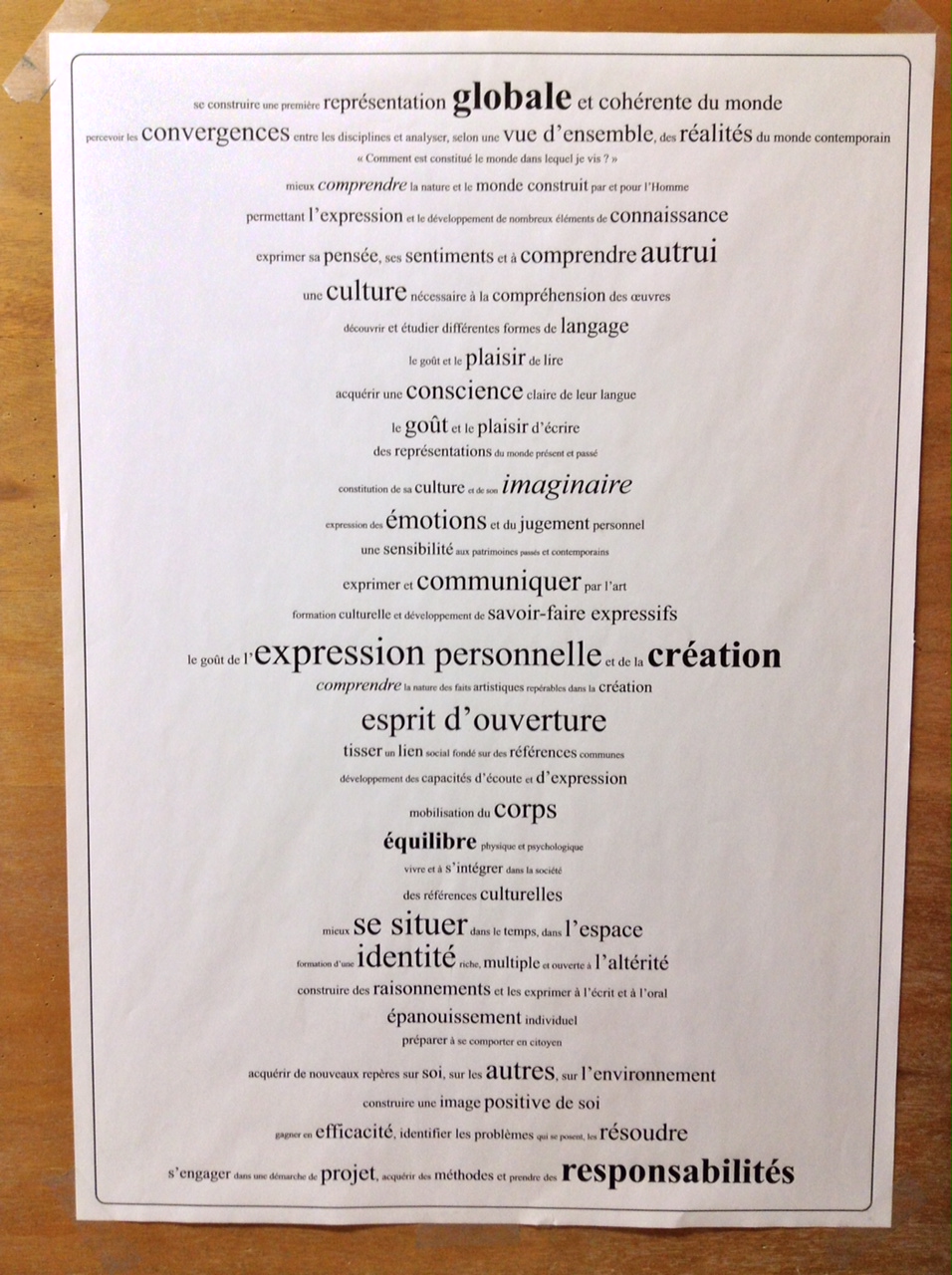 Après avoir lu l’ensemble des programmes officiels de 2008, j’ai créé une liste. J’ai recopié puis mélangé les phrases significatives de chaque objectif disciplinaire. J’ai fait disparaître les disciplines afin d’avoir sous les yeux, non un but ou un objectif, mais une vision de l’enseignement.
