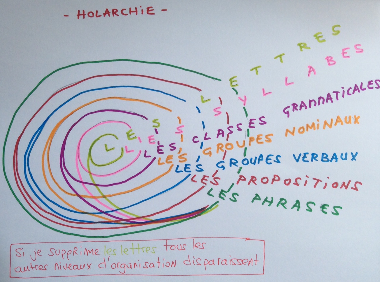 – chaque niveau d’organisation inclut et transcende les précédents. Henri Laborit dans La nouvelle grille ou Arthur Koestler dans Le cheval dans la locomotive présentent cette structure holarchique ; si le plus petit élément constitutif est supprimé alors tous les niveaux supérieurs sont supprimés, et la structure disparaît. Si les lettres sont supprimées, les mots n’existent plus ni les livres.
