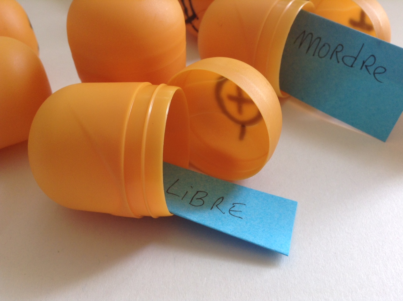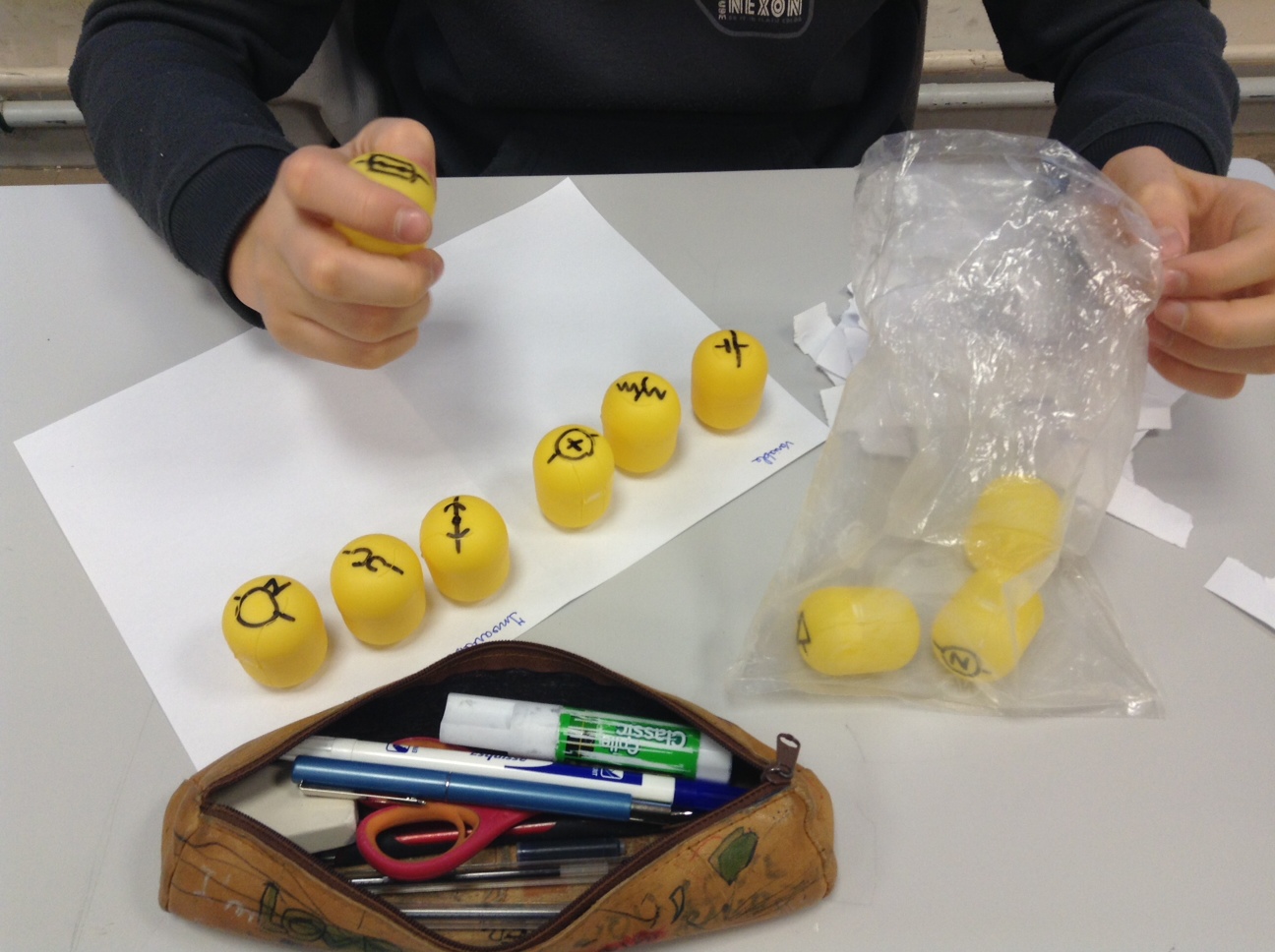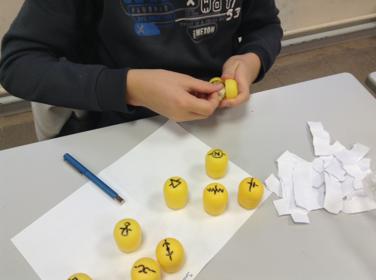 Dans un esprit Jugaad, j’utilise les capsules des oeufs KinderSurprise. Dans une démarche écologique influencée par Cradle To Cradle, « ce déchet devient une ressource ». Avec ces objets, je peux poursuivre la manipulation des classes grammaticales avec des élèves en difficulté, ceux qui ne parviennent pas à manipuler les ensembles, les inclusions, à mémoriser les notions et les connaissances car ils ne parviennent pas à les classer.