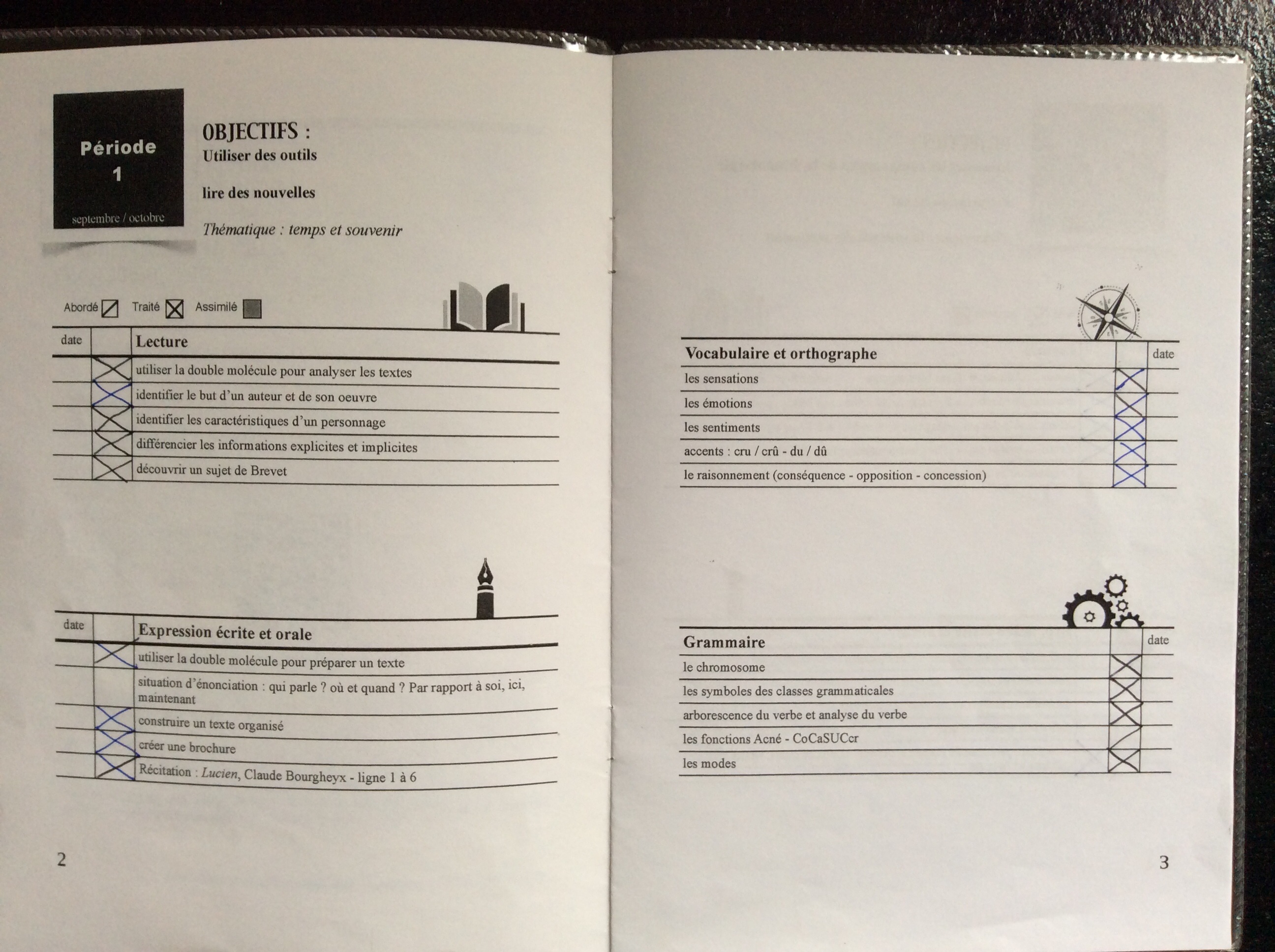 La discussion a eu lieu en février. J’ai aussitôt créé les livrets pour les expérimenter pendant le troisième trimestre 02009, et ainsi pourvoir les modifier et être prêt à les fournir aux élèves en septembre. J’avais émis trois buts pour ce livret :