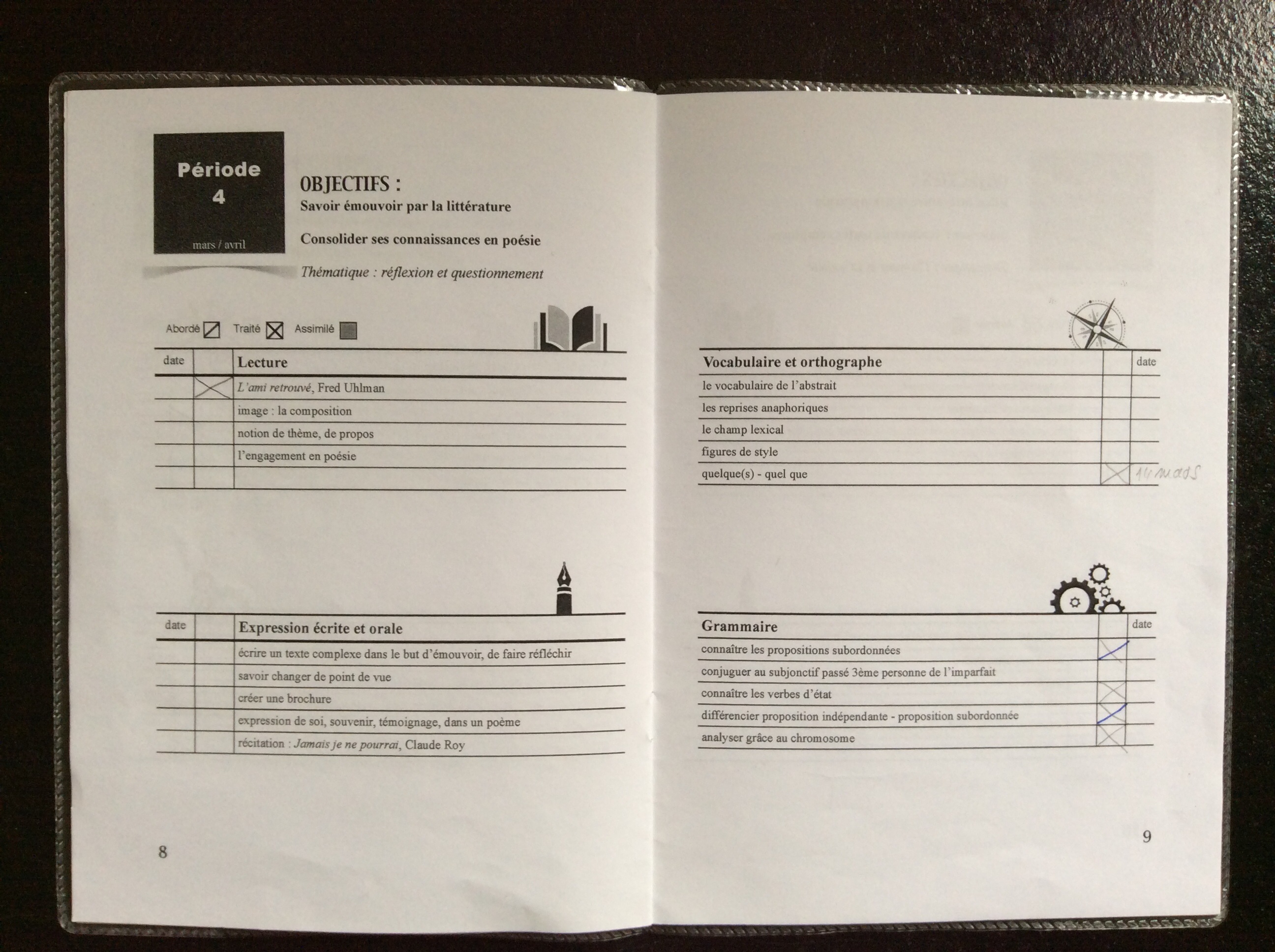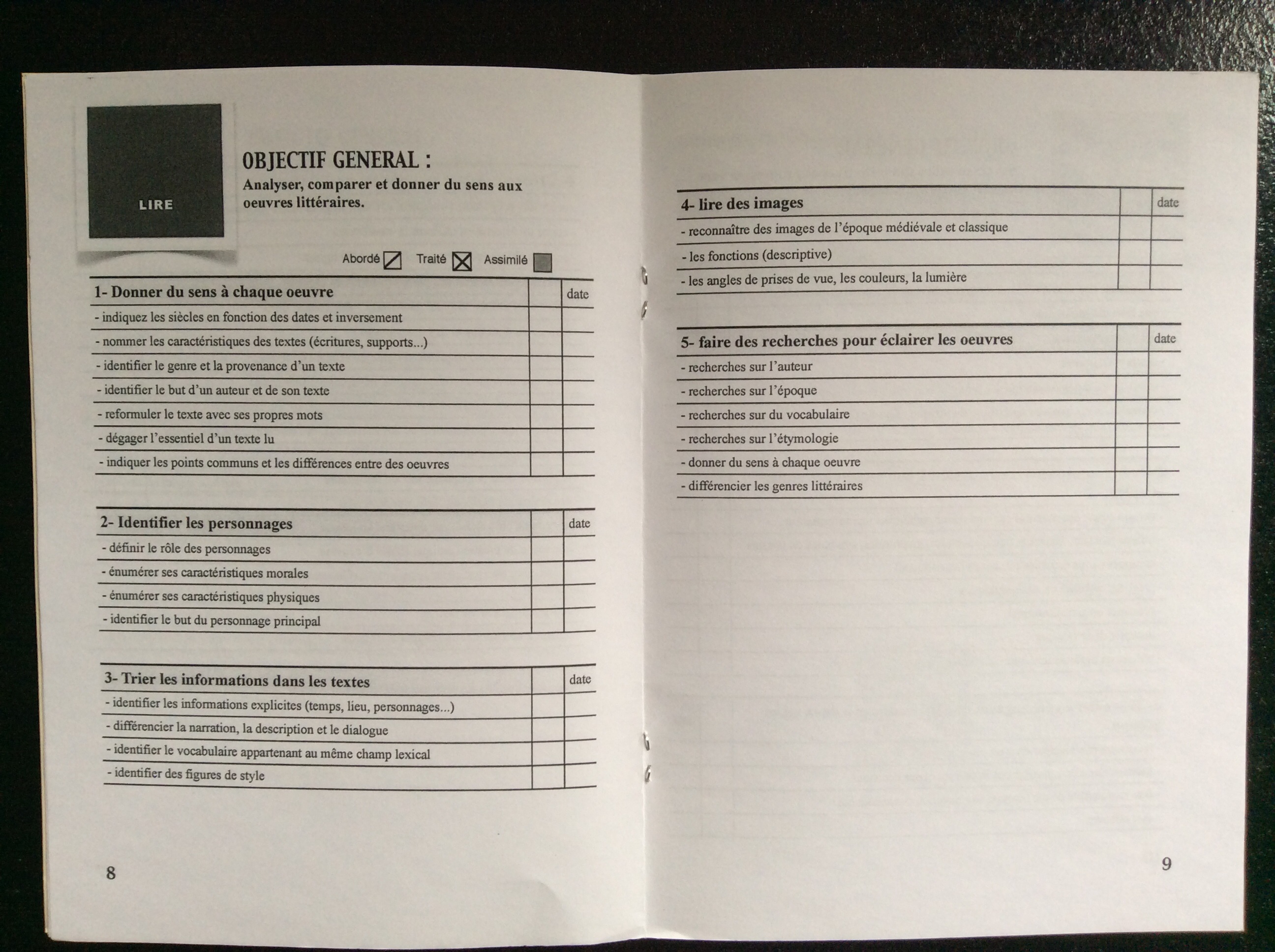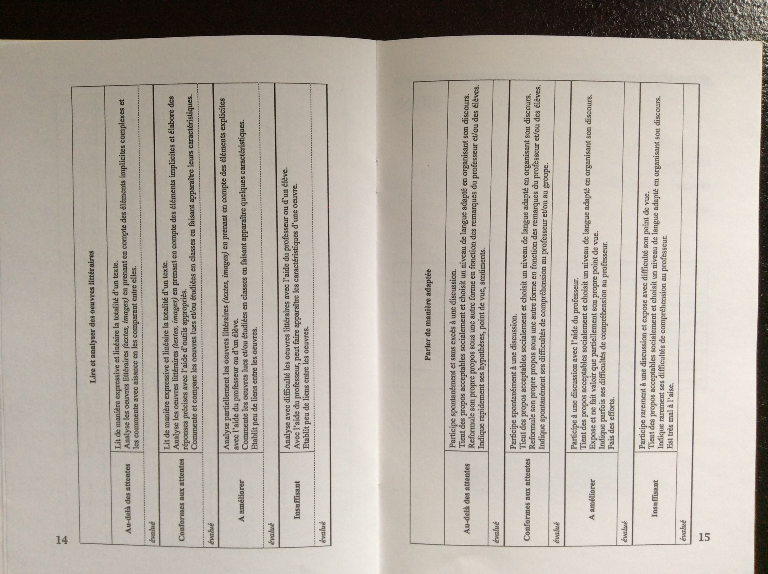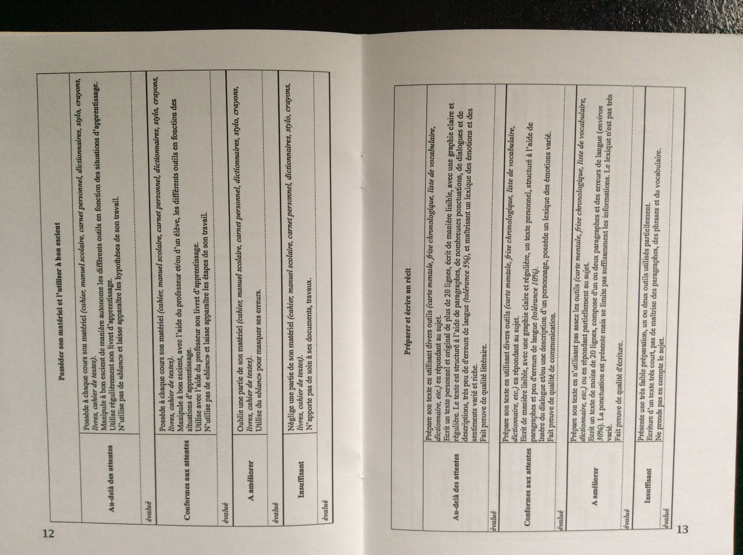 Pour tous les travaux évalués, il me fallait naviguer sur plusieurs pages pour indiquer dans chaque livret les diverses assimilations. Je perdais beaucoup de temps. J’ai conservé ce livret, en ajoutant chaque année des changements, jusqu’en juin 2013. En septembre 2013, j’ai fait quelques changements radicaux.