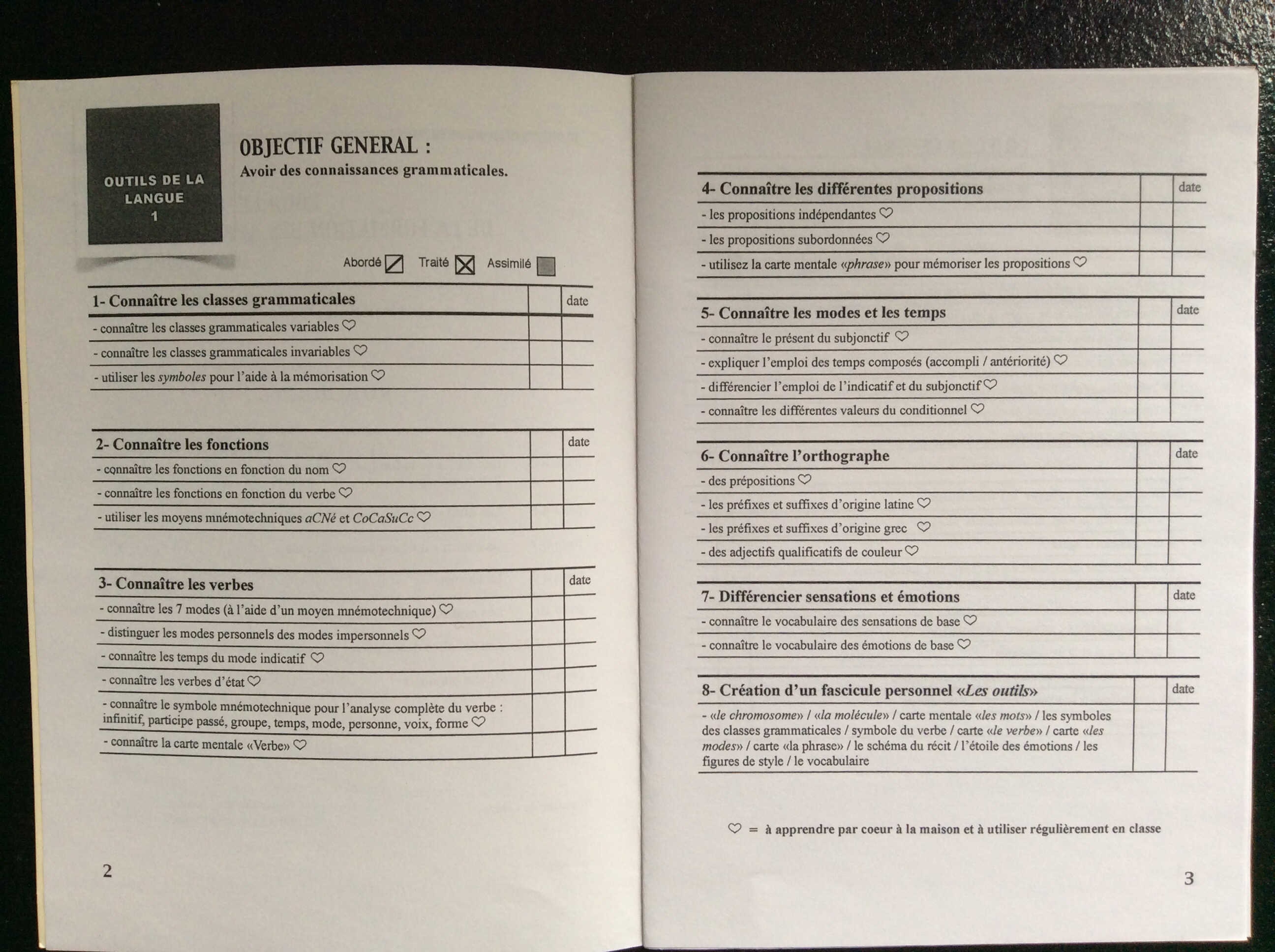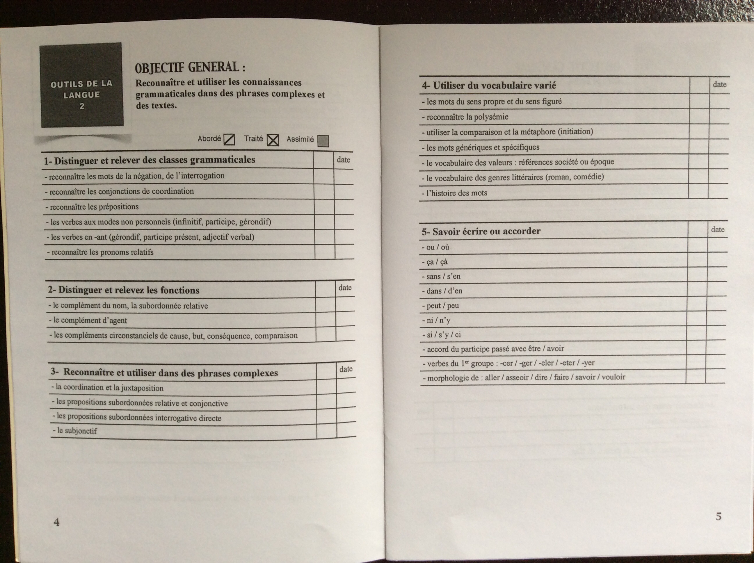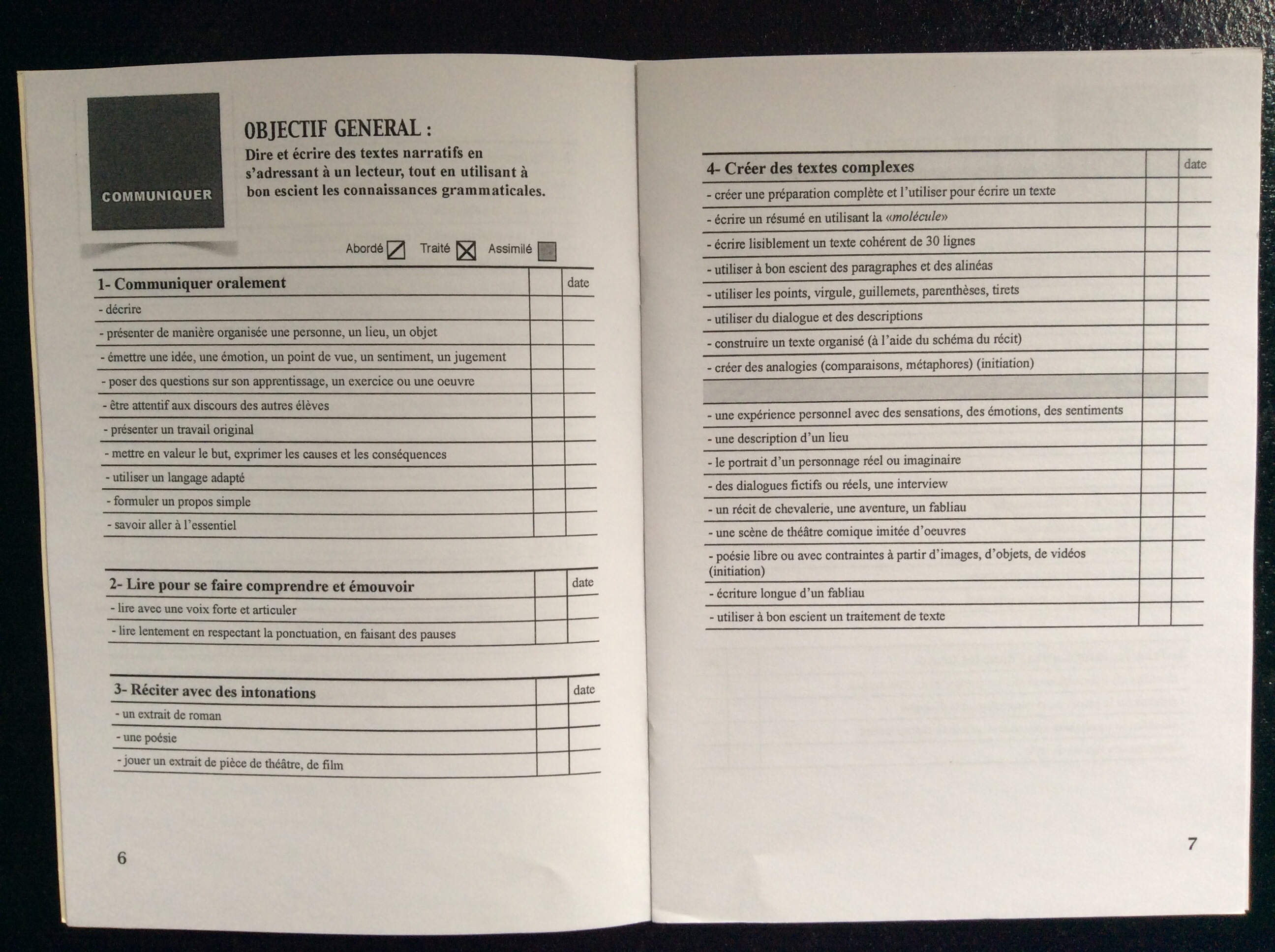 4 janvier 02018 : j’ai abandonné l’utilisation d’un tel livret à la rentrée 02017. Pour l’évaluation de la progression de chaque élève, j’utilise des fiches individuelles collées dans leur cahier.