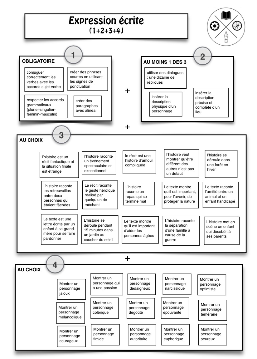 – dans le groupe 2, les élèves peuvent choisir d’ajouter un dialogue et/ou une description physique et/ou la description d’un lieu.