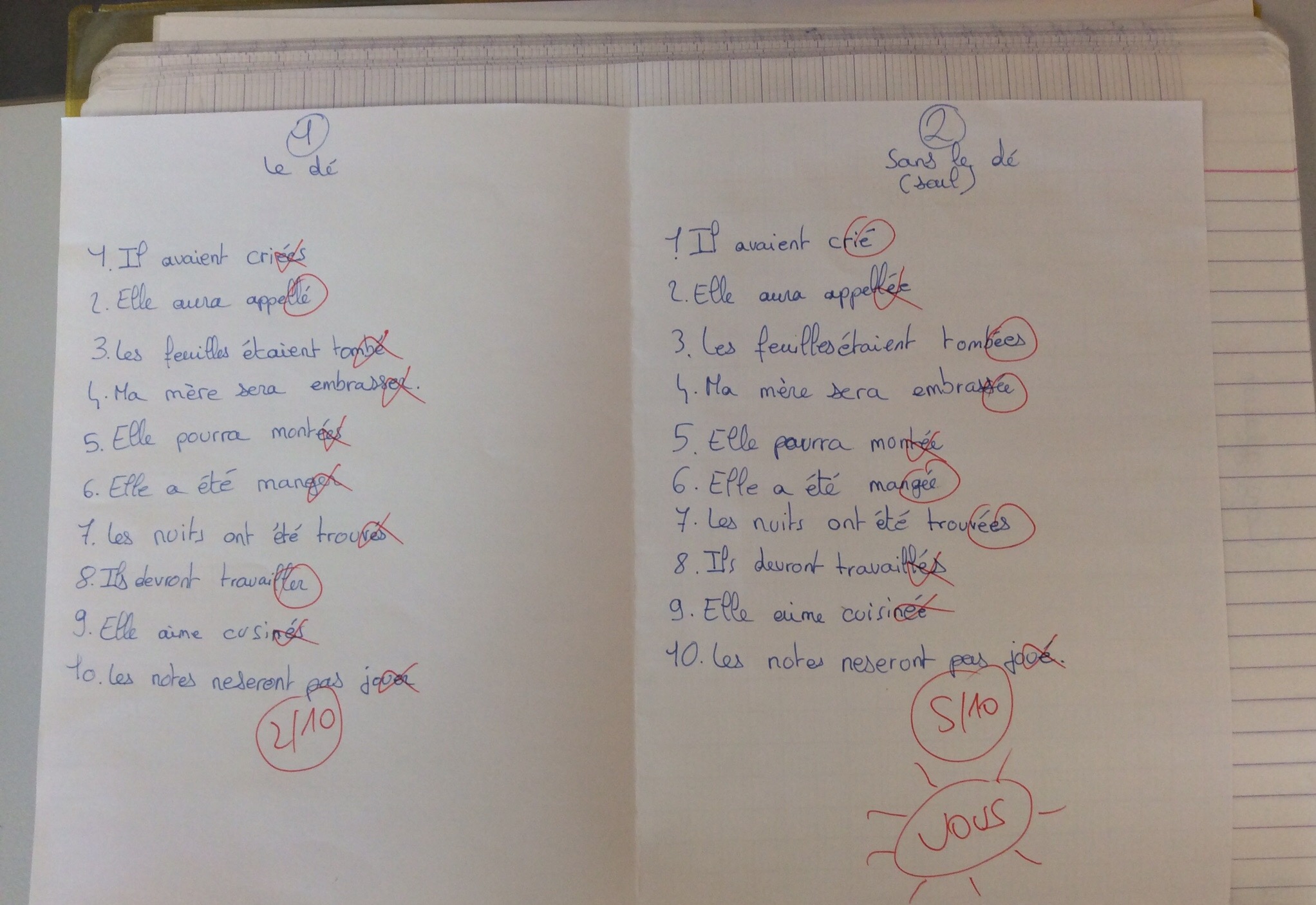 Second exercice, en deux parties, composé de 10 phrases :