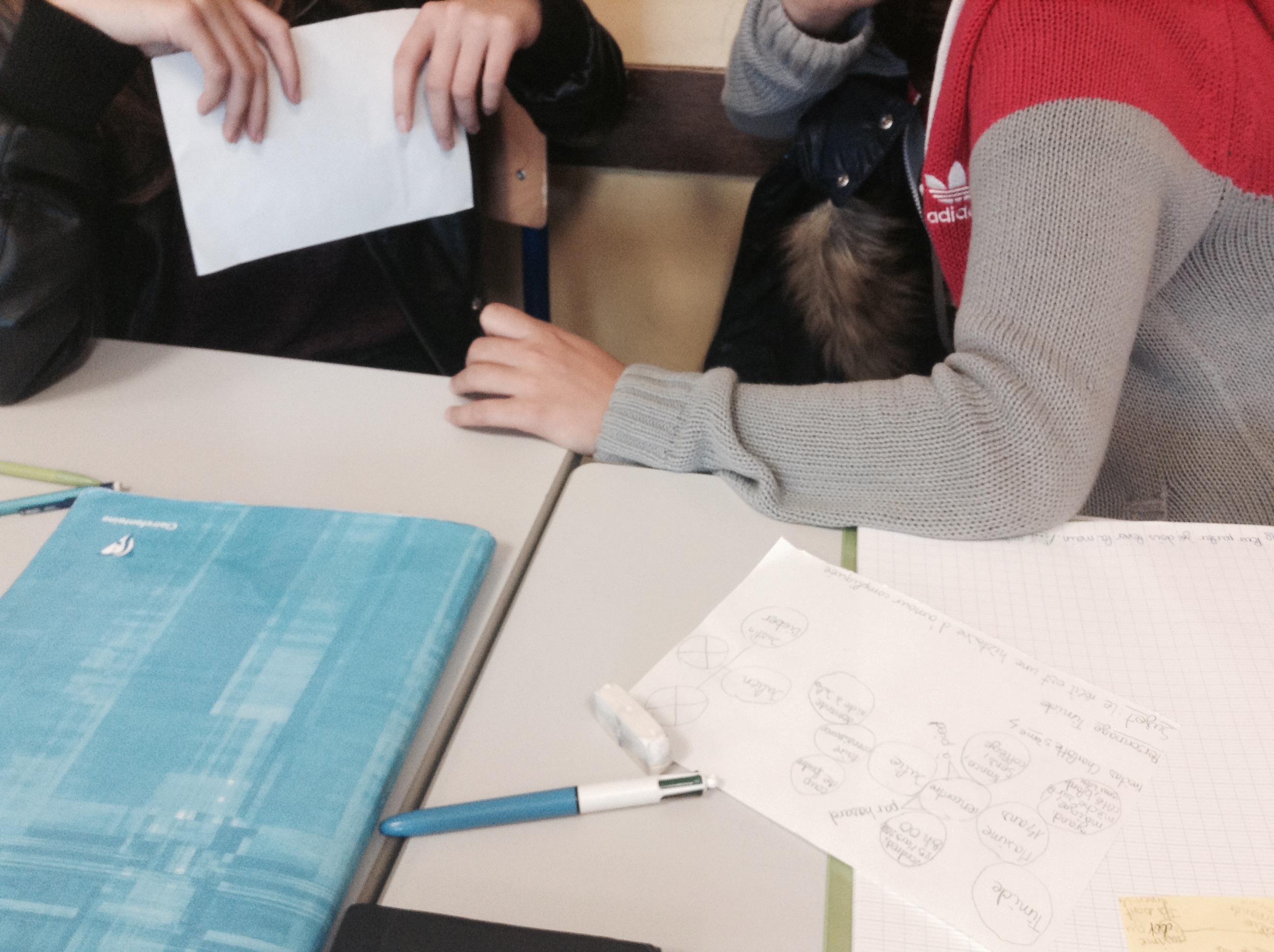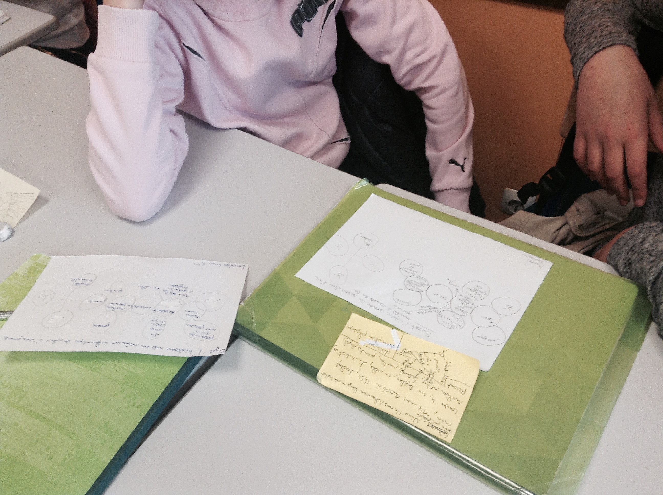 La seconde partie est réalisée en groupe de plusieurs élèves. La classe se transforme en pentagone, au moins. Pendant la fin de l’heure, les élèves recherchent le vocabulaire des sensations et émotions qui devra être inscrit dans leur récit respectif. Les élèves sont soit regroupés au hasard, soit en fonction de leur choix de personnage.