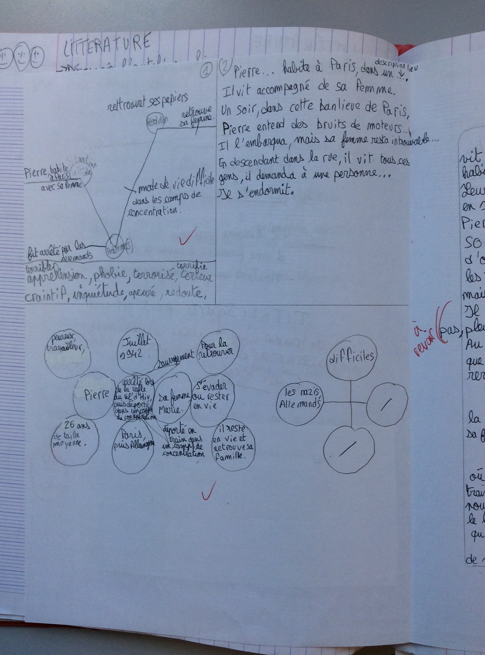 Le cours suivant, dans la journée ou le lendemain, est consacré à l’écriture, en utilisant la préparation complète. Et seulement cette préparation. En effet, les élèves ne peuvent venir avec un texte déjà écrit qu’ils pourraient recopier. Un seul élève a essayé de recopier en cachette le texte écrit par sa maman.