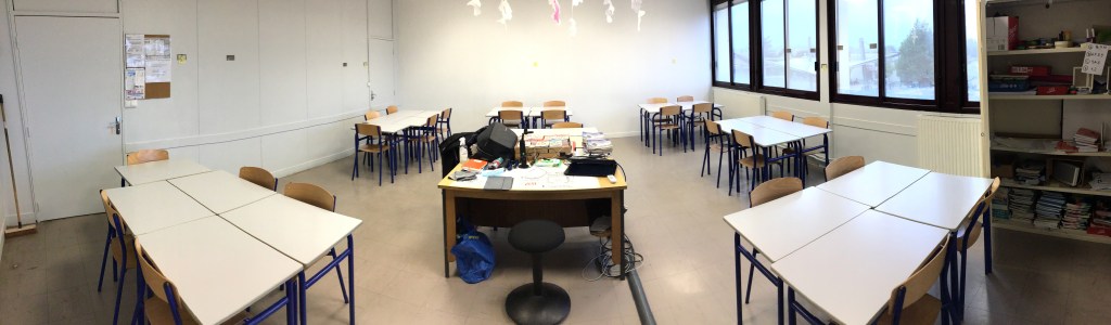 Lorsqu’il est nécessaire que les enfants expérimentent seuls, isolés de leurs voisins, je leur demande de se placer où ils le souhaitent. Ils envahissent alors les espaces vides de la salle en se plaçant dans le sens qu’ils souhaitent. De cette manière, ils ne doivent pas être capable de lire la production de leurs voisins. Ce déplacement de tables ne dure que quelques secondes et je dois avouer que c’est agréable de voir un tel résultat désordonné.