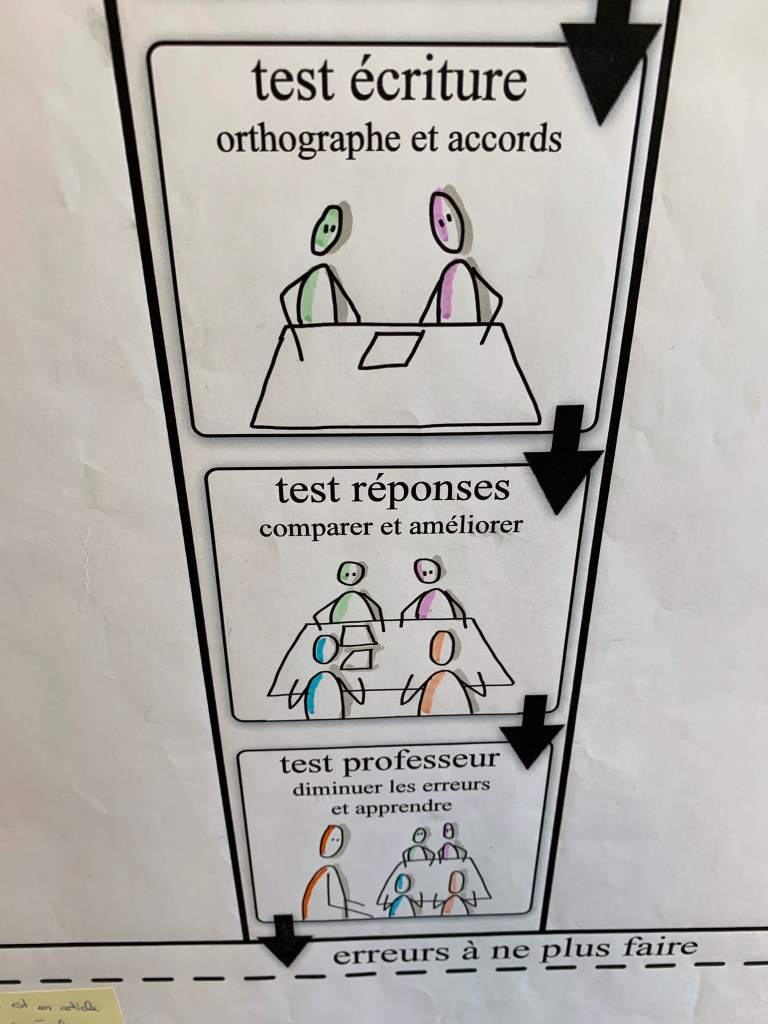 Enfin lorsqu’ils sont prêts à tester leur réponse, il active une petite sonnette pour m’avertir qu’ils sont prêts pour le dernier test. J’observe en premier lieu les erreurs d’orthographe et de grammaire et lorsqu’il y en a, c’est souvent le cas, je replace le post-it sur la case « test orthographe ».