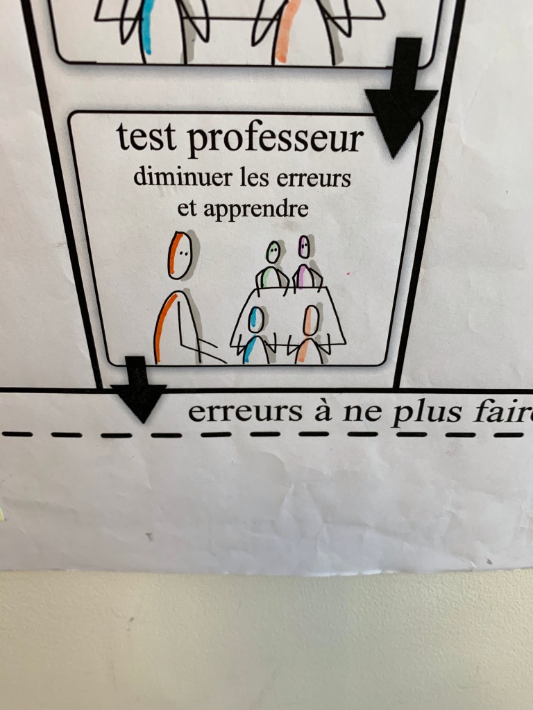 Les erreurs sont recopiées sur un post-it. Elles seront visibles par tout le groupe, ou par toute la classe, pendant la durée de l’activité. Ensuite, cette erreur sera déposée sur un panneau affiché dans la classe. Il est capital de mettre concrètement en place des espaces visibles pour que les erreurs soient considérées comme faisant partie du processus d’apprentissage. Supprimer les erreurs, c’est supprimer l’apprentissage. Et supprimer l’apprentissage, c’est supprimer la confiance en soi, la curiosité, la créativité.