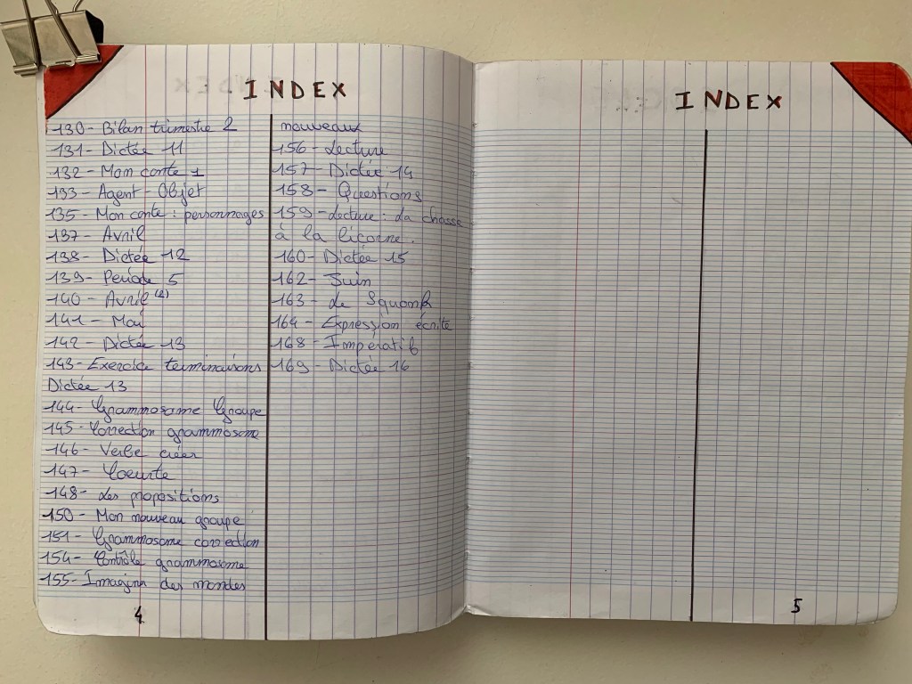 Dès qu’une page est commencée dans le JourdEx, les élèves doivent l’inscrire dans l’index.