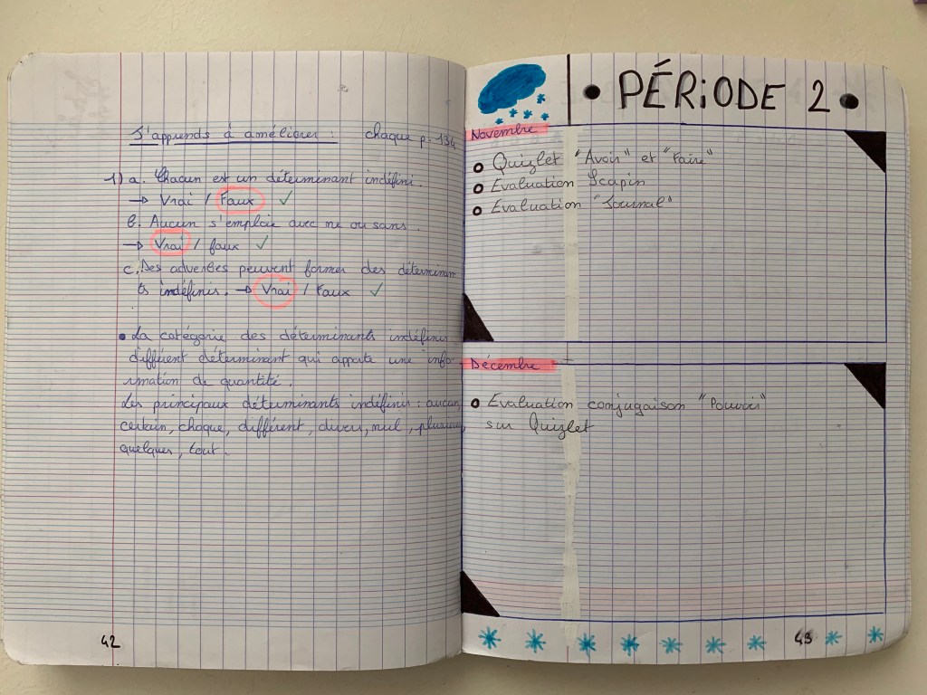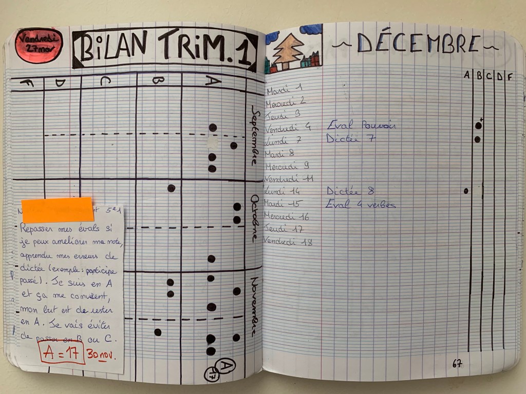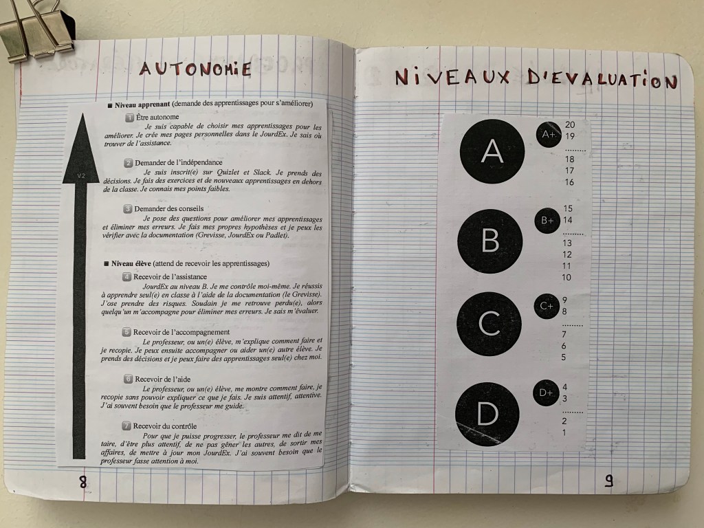 Le JourdEx est donc le lieu dans lequel chaque élève apprend à s’organiser, expérimente la table des matière, la numérotation, l’écriture de titre qui ait du sens, etc. Puisque les élèves ont le droit d’utiliser leur JourdEx à chaque évaluation, ils apprennent ainsi que le tenir à jour et écrire correctement a du sens pour progresser.