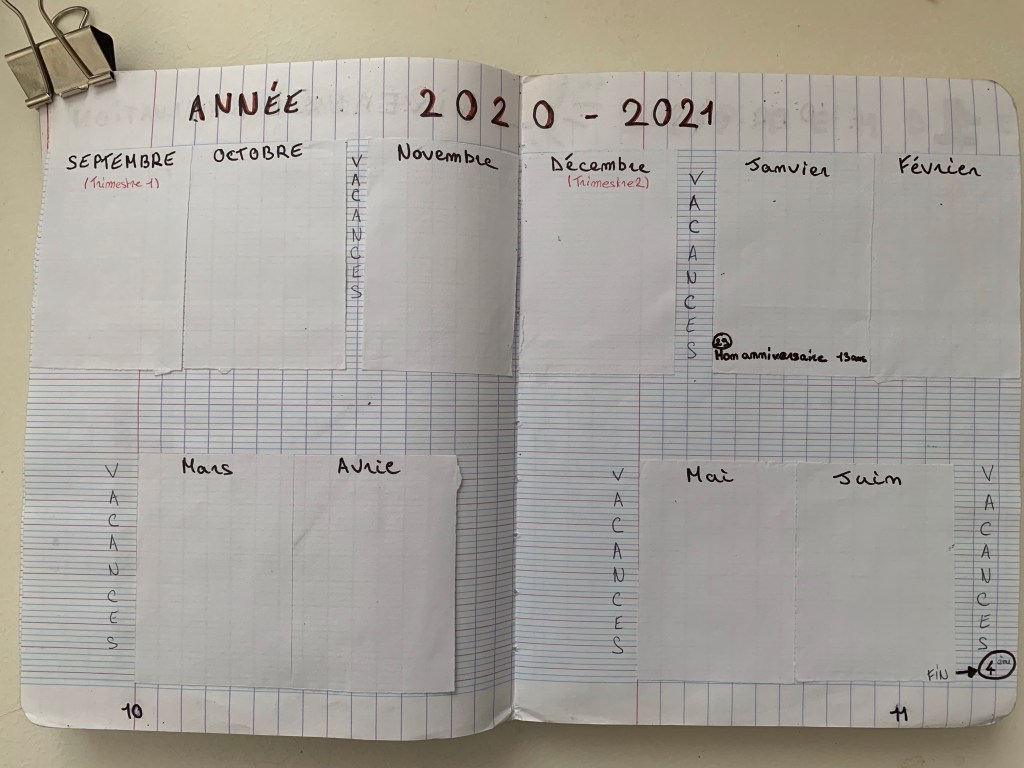Je n’ai pas su comment utiliser cette double page sur l’année. Je me demande si elle est bien utile. Pour le moment je ne l’élimine pas du futur JourdEx.