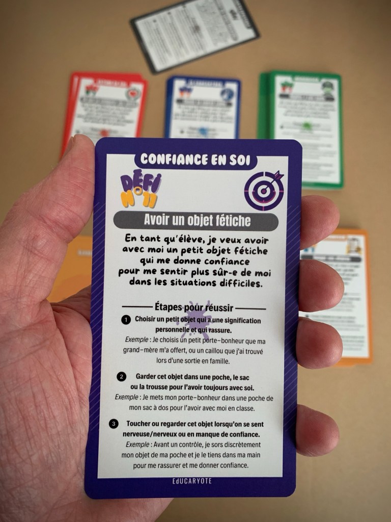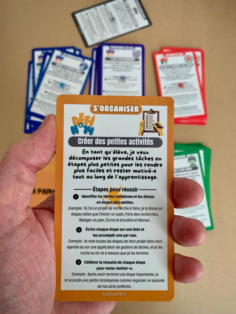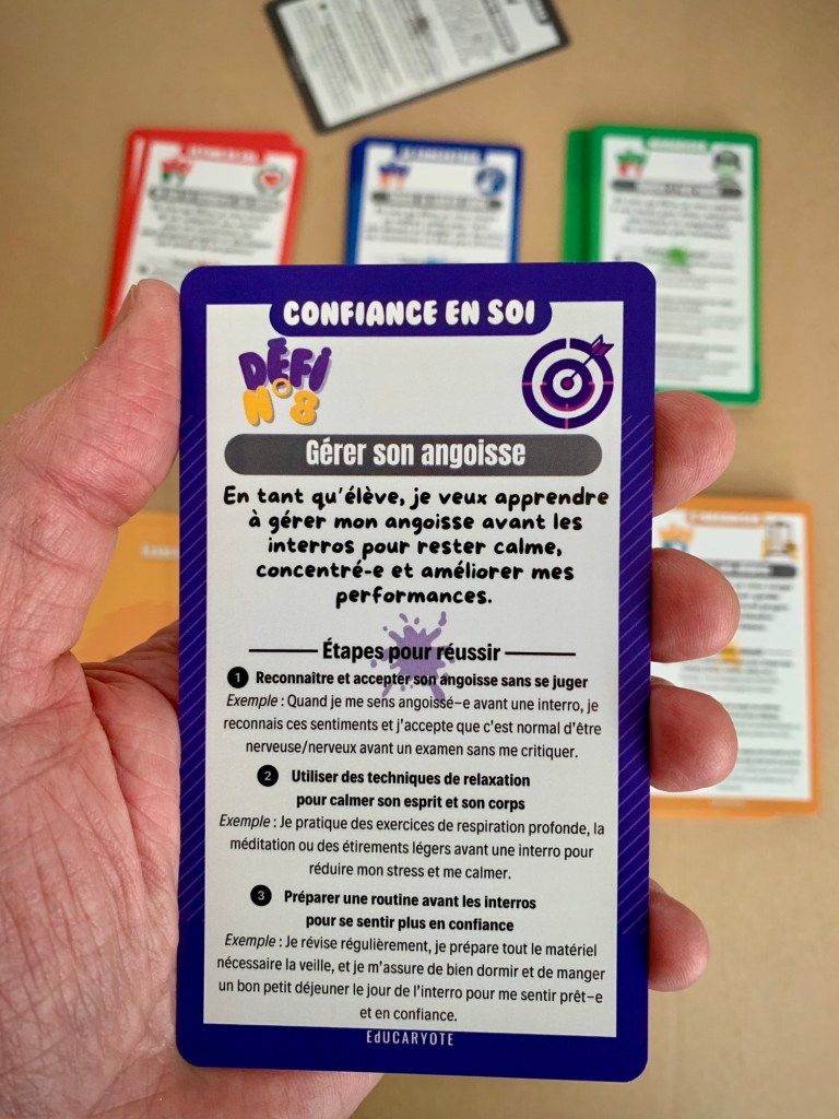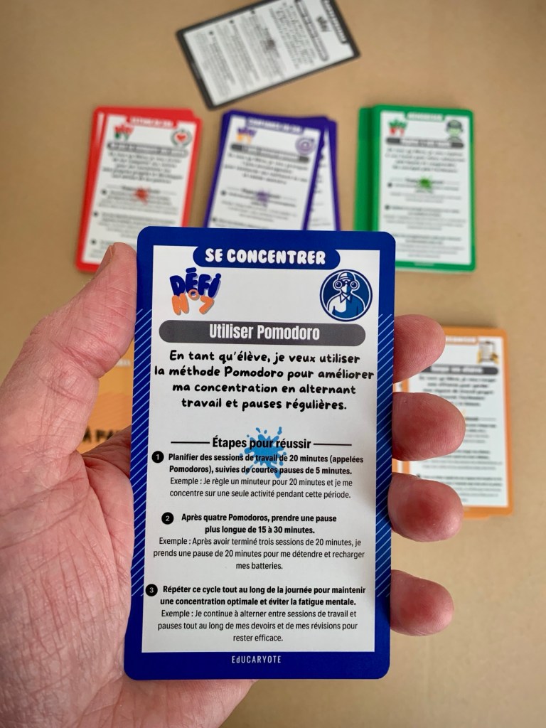 Il est destiné aux élèves de 15 à 18 ans et au-delà. De la même manière que les cartes DEFI, cet outil permet aux élèves d’approfondir les méthodes de travail, la mémorisation, mais surtout la confiance en soi dans la préparation des examens et la réflexion sur l’orientation.