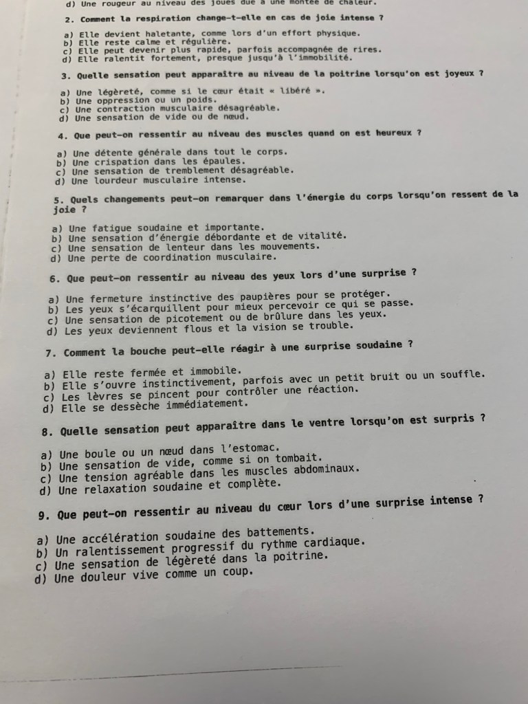 Pour renforcer cette découverte, je propose un QCM sur les ressentis corporels associés aux émotions. L’objectif est de leur permettre d’identifier les signaux physiques liés aux émotions, tels qu’une accélération cardiaque pour la peur ou une détente musculaire pour la joie.