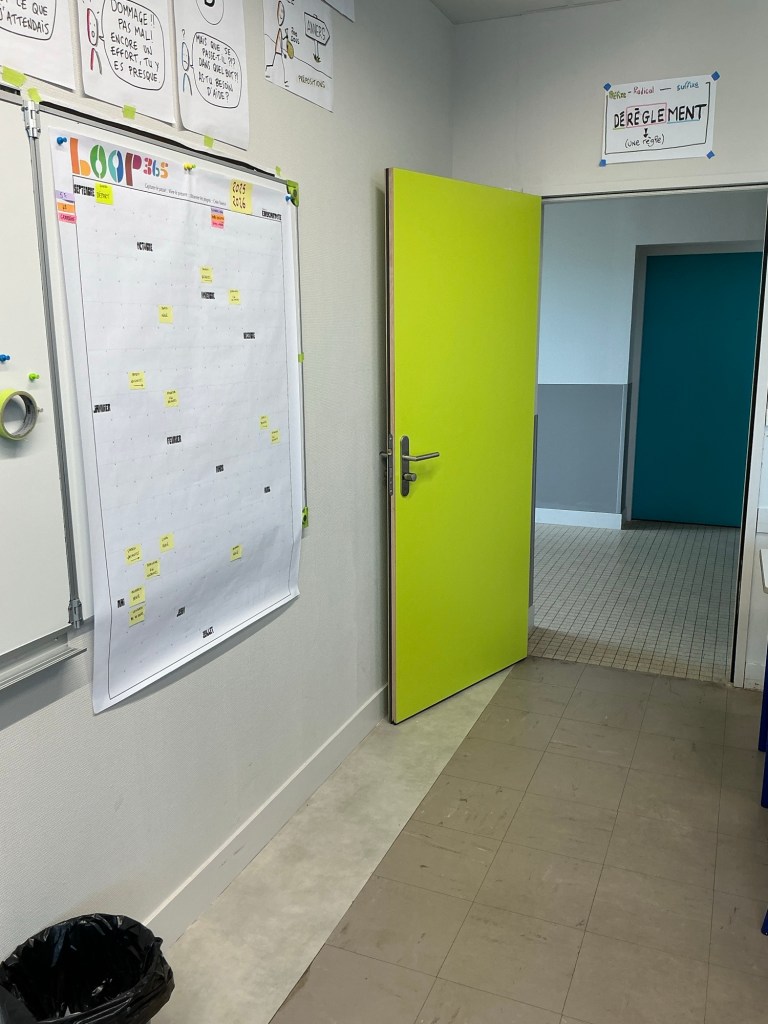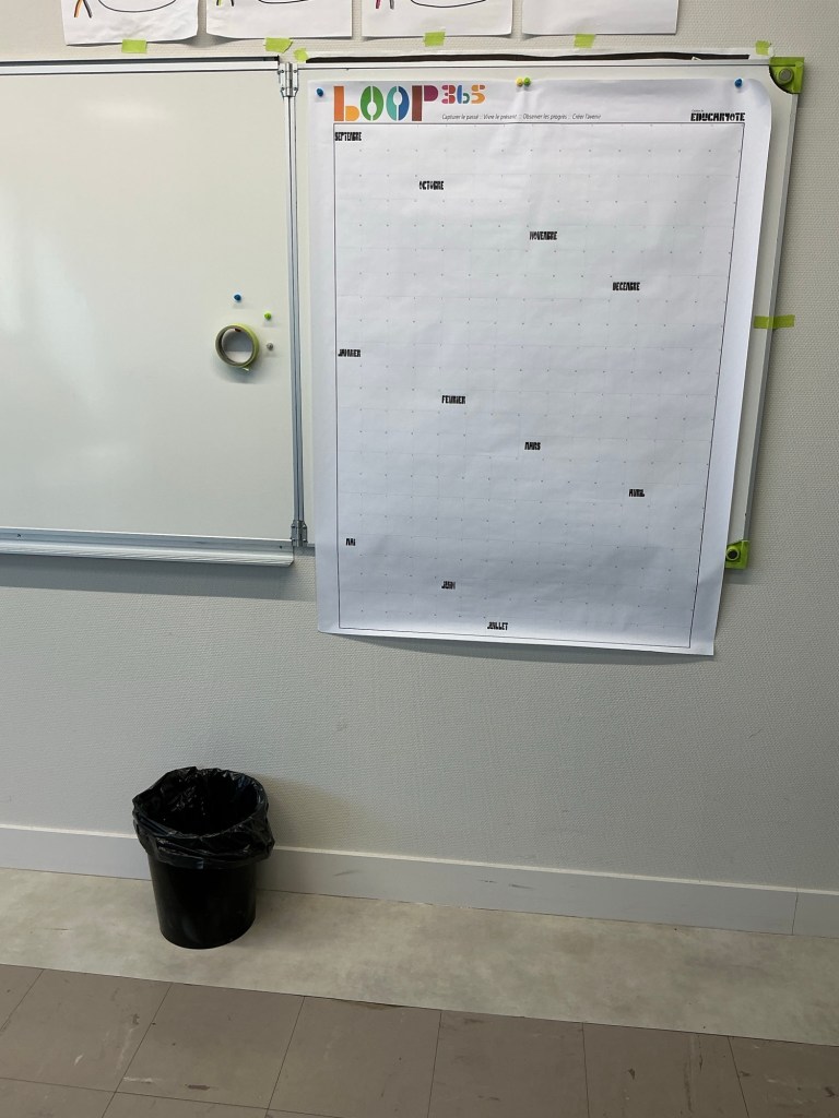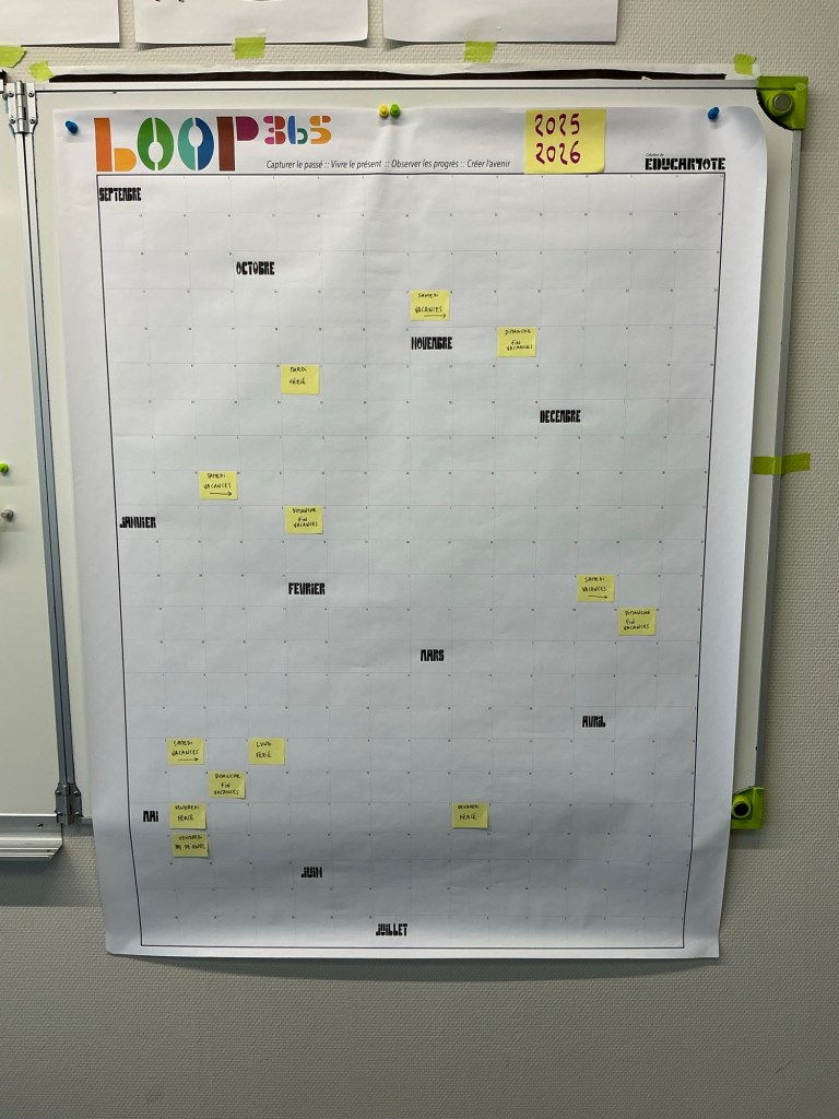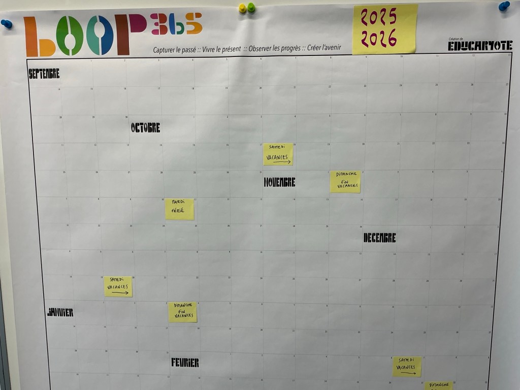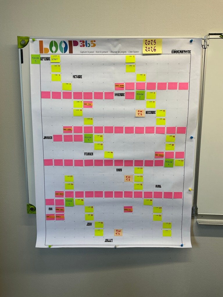 J’y note les grandes étapes de l’année, les projets en cours, les repères liés aux connaissances, aux compétences ou aux notions à enseigner. Et je le fais avec de simples post-it, pour pouvoir déplacer, ajuster, adapter.