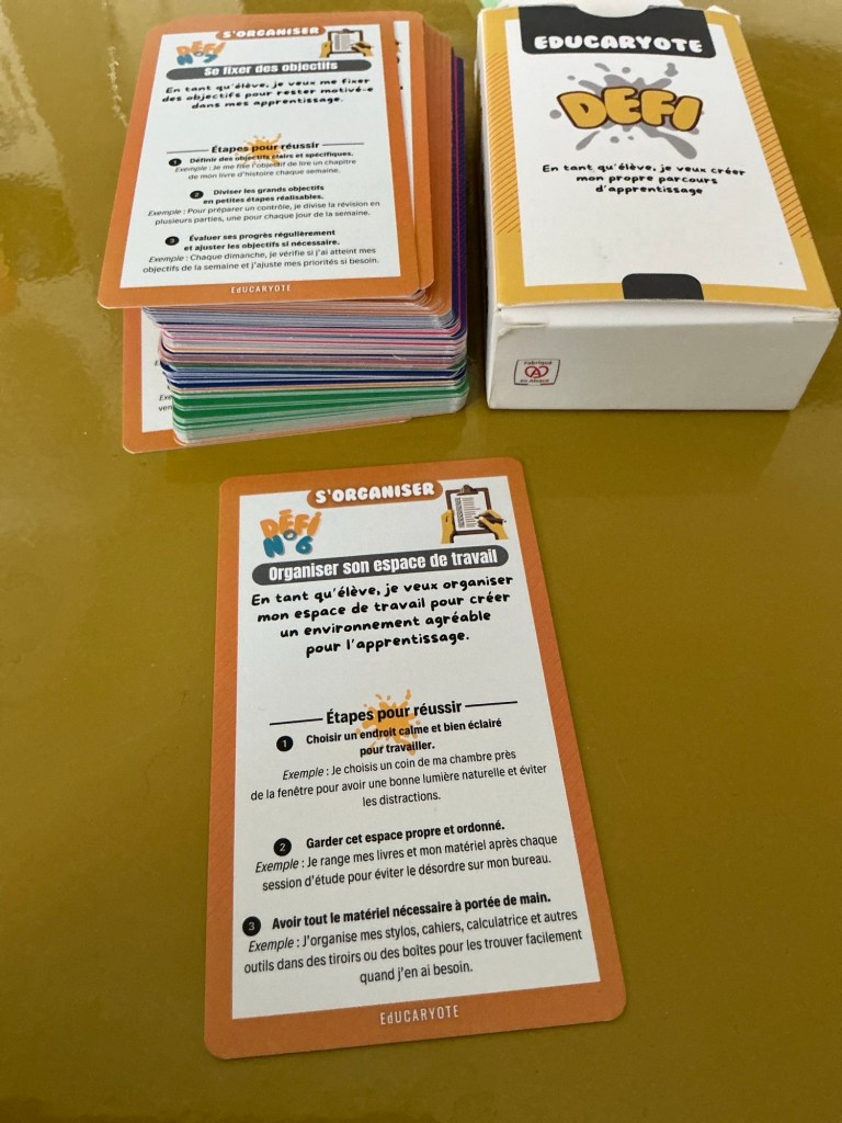 Ces murs ne sont pas décoratifs, ils font partie intégrante de ma pédagogie agile, au même titre que mes cartes « DÉFI », que j’ai créées pour guider les élèves pas à pas. Ces cartes leur donnent des conseils très concrets : comment organiser son espace de travail, comment se fixer des objectifs, comment préparer une révision, comment avoir confiance en soi. L’affichage mural et les cartes se complètent : le premier rend visible les savoirs, les secondes accompagnent les gestes et les habitudes d’apprentissage.
