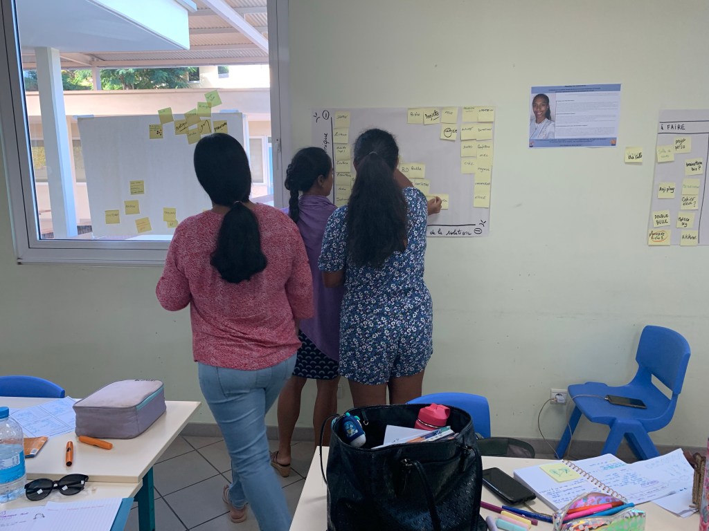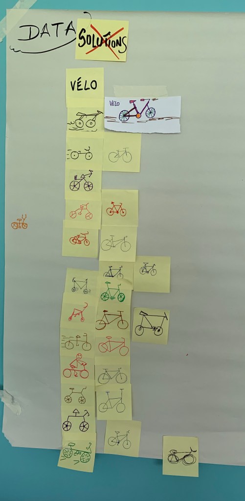 En groupe de 4 personnes : recherches des idées en brainstorming. Difficultés pour lâcher-prise afin de trouver des idées incroyables. Différencier idée et solution.