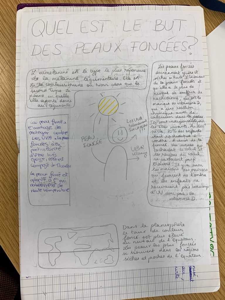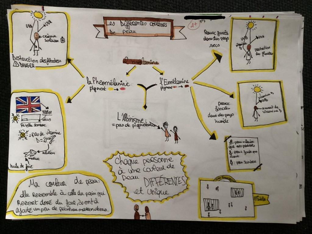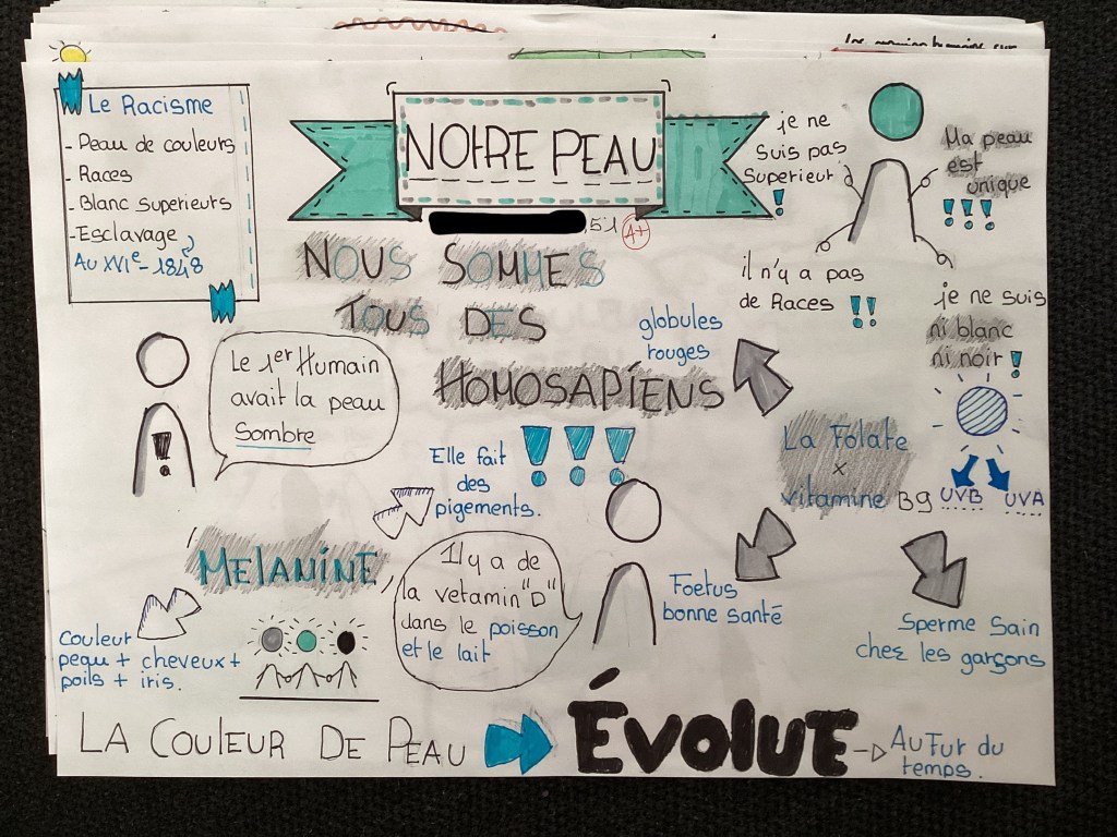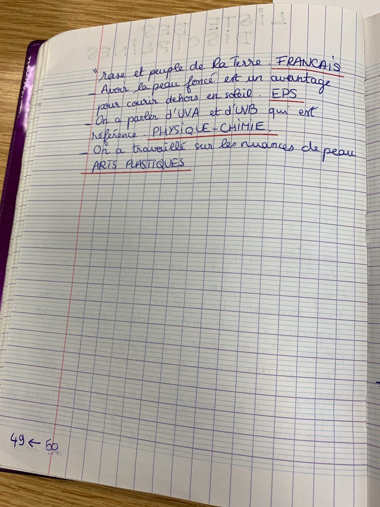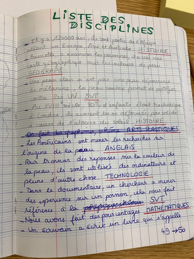Grâce au documentaire et à leurs prises de notes, les élèves ont pu constater que pour comprendre les couleurs de peau, il fallait utiliser plusieurs disciplines, non pas conjointement, mais toutes ensembles.