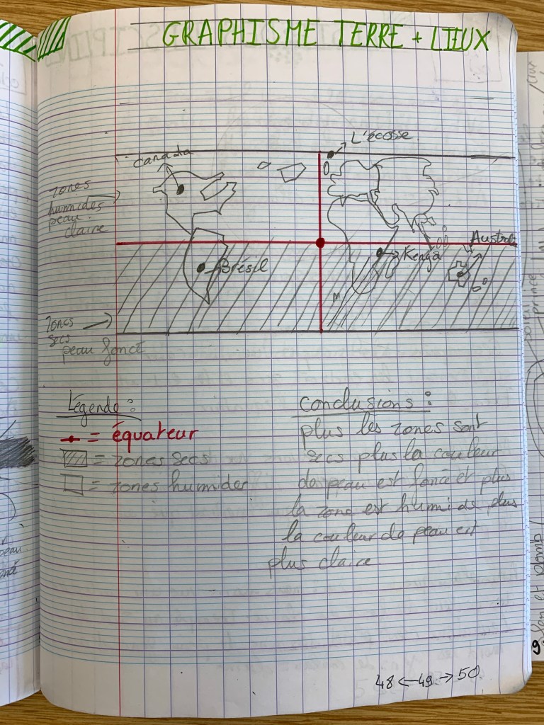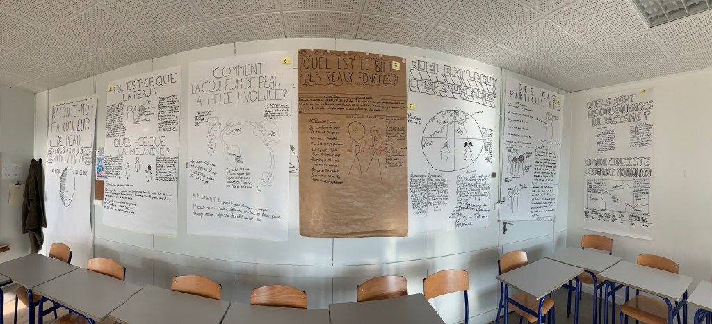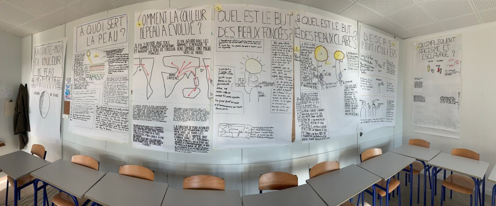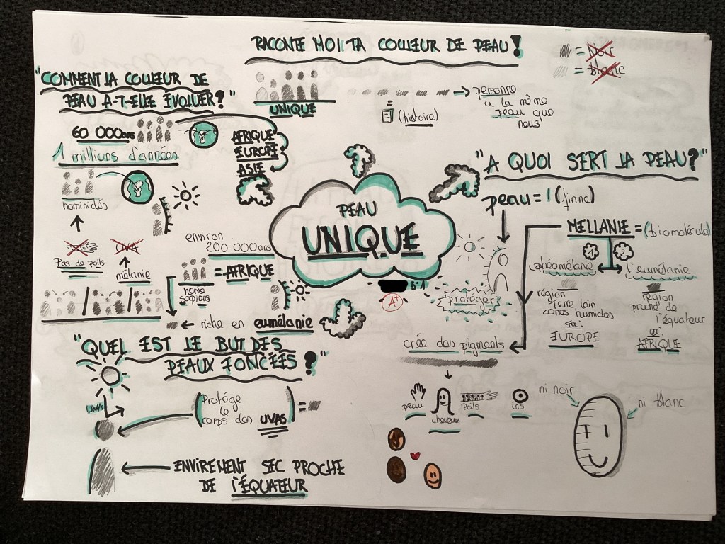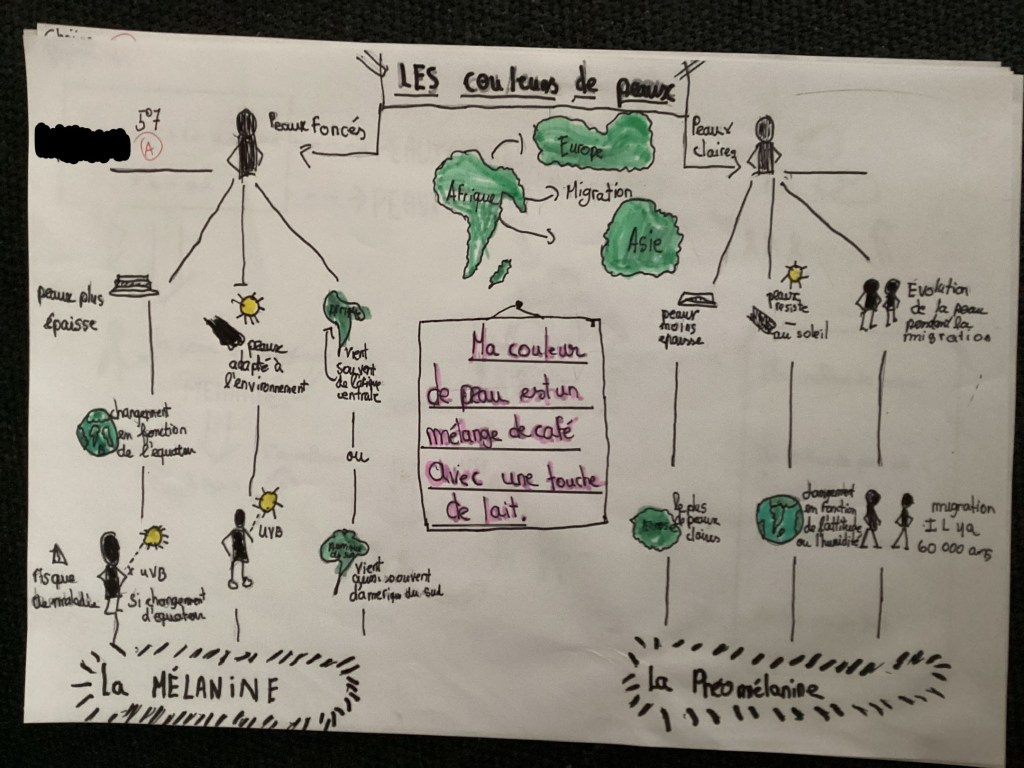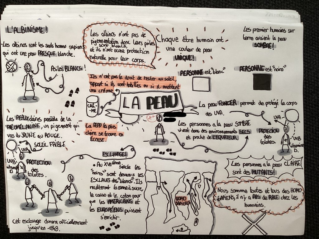 Grâce au documentaire et à leurs prises de notes, les élèves ont pu constater que pour comprendre les couleurs de peau, il fallait utiliser plusieurs disciplines, non pas conjointement, mais toutes ensembles.