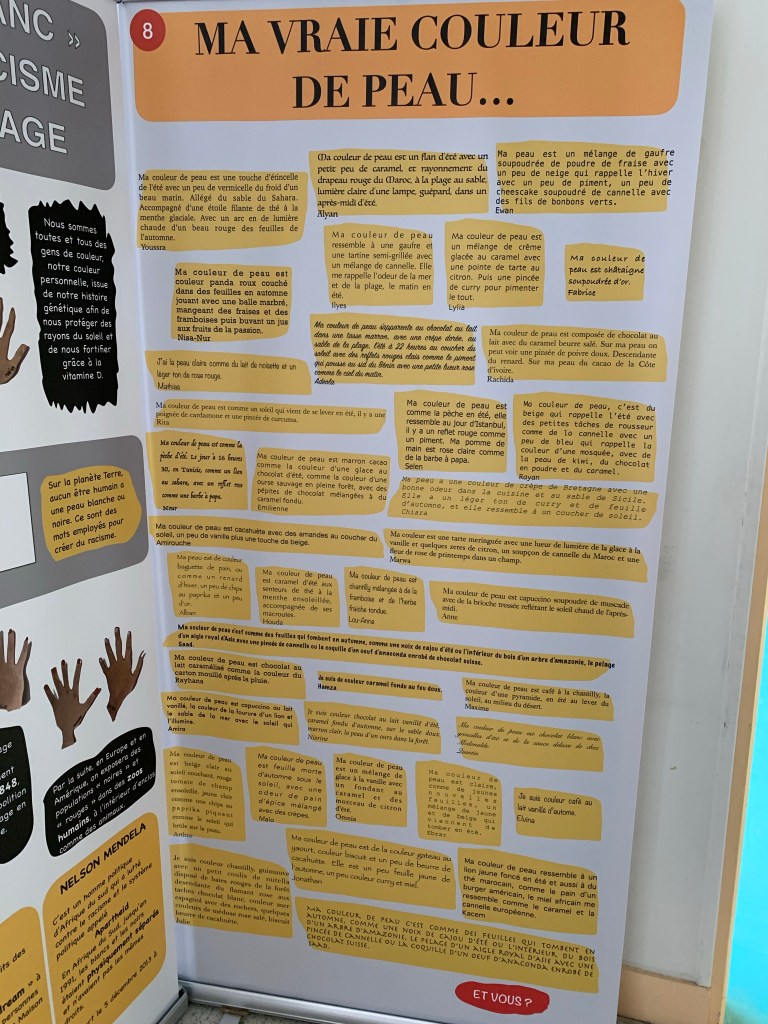 Puisque nous ne sommes ni « noir » ni « blanc », les élèves ont décrit leur propre couleur de peau. Ils ont vu que celle-ci est unique au monde. leur texte reflète cette observation. Les textes sont présents sur le panneau n°8. C’est en quelque sorte la cerise sur le gâteau.
